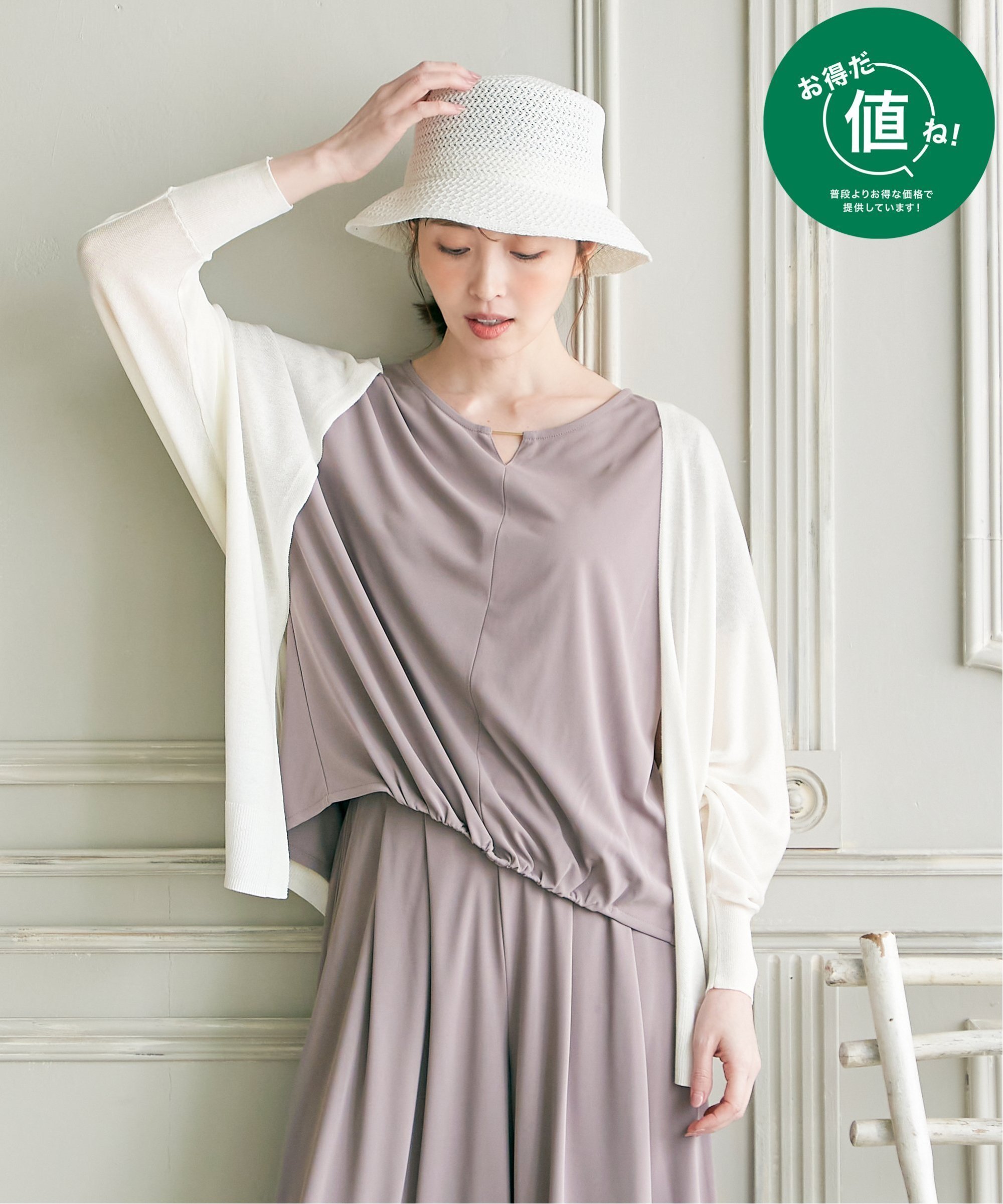 ikka(イッカ)冷感ドルマントッパーカーディガン夏の悩みを解消しながらおしゃれを叶えてくれる暑い夏を乗りきるうえで重宝する、機能的カーディガンです。【素材】やわらかくナチュラルな表情ながら、落ち感があり高見えする麻混素材を使用。風に揺れる素材感だから、暑苦しく見えず夏のお出かけに必需品!【デザイン】ヌケ感の出るゆったりしたドルマンタイプのトッパーカーディガン。トレンドのクロップド丈だから、ボリュームスカートともバランスがとりやすいです。サッと羽織って、それだけで様になる夏のお出かけの定番スタイルに欠かせません。【ikkaポイント】ボディーラインを拾わず、適度なシアー感が華奢見え効果も期待できます。薄くて軽いので持ち運びしやすく、UV対策や冷房対策などマルチにお使いいただけます。洗濯機洗い可能で、暑い時期のデイリー使いに重宝します。【おすすめコーディネート】コーデの主役になれるグリーン系のカラーから、お仕事やきちんとした装いにも着られるオフ・ブラックなど、多彩なカラー展開なのでその日の予定に合わせてください♪■お得だ値(ね)!とは?普段より「お得な価格」で提供している商品です。-コストダウンの取り組み-・生産地を見直し、製造コストをダウン・工場の閑散期に生産することで、製造コストをダウン・オリジナル素材を開発し、素材コストをダウン今シーズンは「値下げ」をしない安心価格です!型番:12140326-02-92 KW3924【採寸】サイズ着丈バスト裄丈S6413461M6514063L6714666商品のサイズについて【商品詳細】中国素材:レーヨン89% ナイロン11%サイズ:S、M、L洗濯機洗い可(非常に弱く)※画面上と実物では多少色具合が異なって見える場合もございます。ご了承ください。商品のカラーについて 【予約商品について】 ※「先行予約販売中」「予約販売中」をご注文の際は予約商品についてをご確認ください。■重要なお知らせ※ 当店では、ギフト配送サービス及びラッピングサービスを行っておりません。ラッピング・ギフト配送について同時に複数の商品を注文された場合メーカー希望小売価格についてご利用ガイドikka(イッカ)冷感ドルマントッパーカーディガン夏の悩みを解消しながらおしゃれを叶えてくれる暑い夏を乗りきるうえで重宝する、機能的カーディガンです。【素材】やわらかくナチュラルな表情ながら、落ち感があり高見えする麻混素材を使用。風に揺れる素材感だから、暑苦しく見えず夏のお出かけに必需品!【デザイン】ヌケ感の出るゆったりしたドルマンタイプのトッパーカーディガン。トレンドのクロップド丈だから、ボリュームスカートともバランスがとりやすいです。サッと羽織って、それだけで様になる夏のお出かけの定番スタイルに欠かせません。【ikkaポイント】ボディーラインを拾わず、適度なシアー感が華奢見え効果も期待できます。薄くて軽いので持ち運びしやすく、UV対策や冷房対策などマルチにお使いいただけます。洗濯機洗い可能で、暑い時期のデイリー使いに重宝します。【おすすめコーディネート】コーデの主役になれるグリーン系のカラーから、お仕事やきちんとした装いにも着られるオフ・ブラックなど、多彩なカラー展開なのでその日の予定に合わせてください♪■お得だ値(ね)!とは?普段より「お得な価格」で提供している商品です。-コストダウンの取り組み-・生産地を見直し、製造コストをダウン・工場の閑散期に生産することで、製造コストをダウン・オリジナル素材を開発し、素材コストをダウン今シーズンは「値下げ」をしない安心価格です!型番:12140326-02-92 KW3924【採寸】サイズ着丈バスト裄丈S6413461M6514063L6714666商品のサイズについて【商品詳細】中国素材:レーヨン89% ナイロン11%サイズ:S、M、L洗濯機洗い可(非常に弱く)※画面上と実物では多少色具合が異なって見える場合もございます。ご了承ください。商品のカラーについて