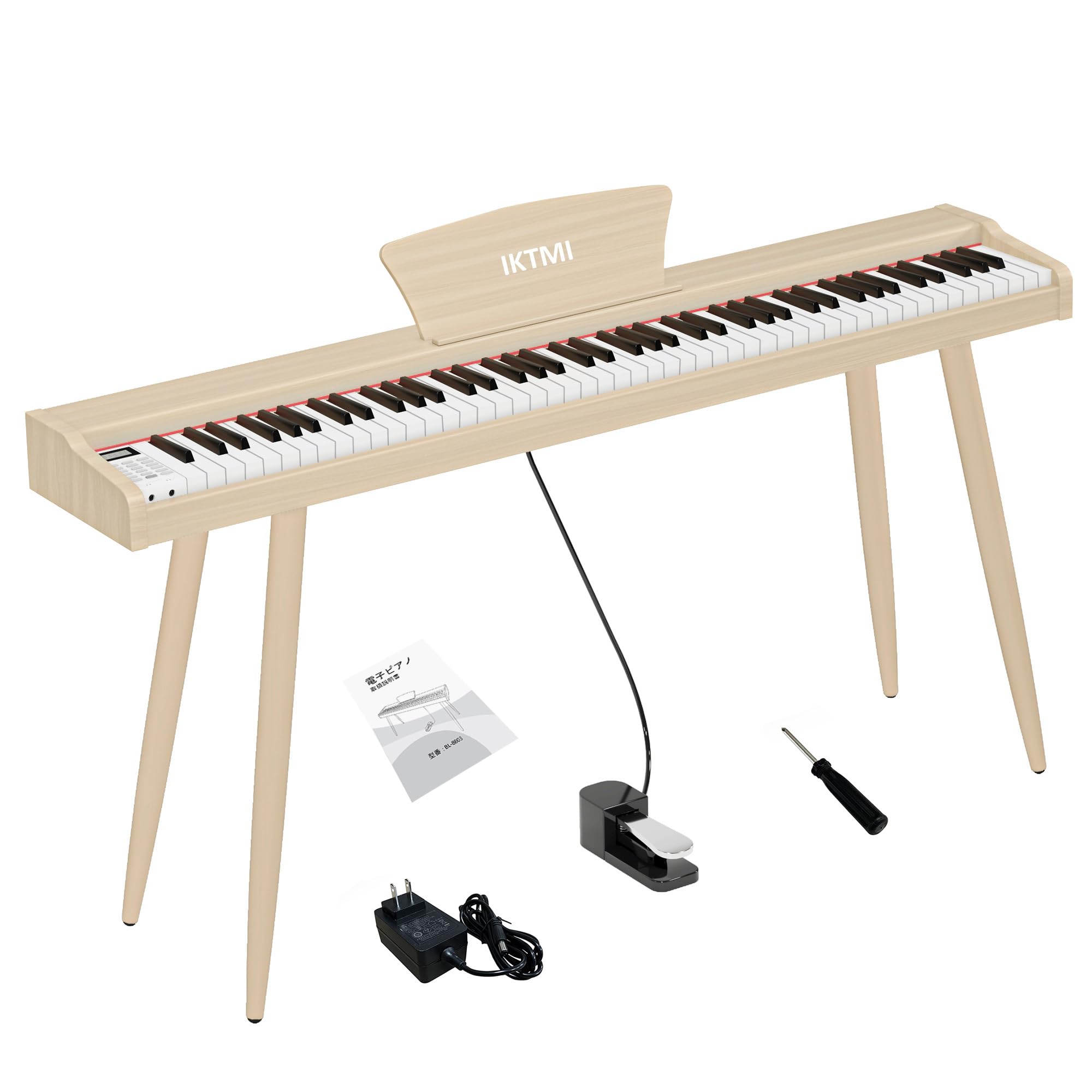 ・【快適なピアノ演奏体験】IKTMI 88鍵電子ピアノは、本物のピアノに近いメカニカルなリズムを持つベロシティセンシティブ鍵盤を搭載しており、鍵盤の強弱によって音の強弱を表現することができます。 また、鍵盤は本物のピアノと同じ大きさなので、エントリーモデルでもグランドピアノのような演奏体験ができます。・【豊富な機能】移調、自動伴奏、ベロシティ調整、メトロノームなど、多彩な機能に対応した鍵盤ピアノです。フランス製最高級DREAMデジタル音源を搭載し、グランドピアノに迫る表現力と臨場感、力強くきらびやかな音色、豊かな低音の響きを実現しました。 2人同時に演奏が楽しめる2人鍵盤モードも搭載。・【スタイリッシュな外観デザイン】この電子ピアノのスタイリッシュな外観デザインと温かみのあるログカラーはどんな場所にもマッチし、伝統的なアップライトピアノよりも薄くて軽く、電子ピアノスタンドの支持脚は床を傷つけないように設計されており、スペースを取らずに部屋に絶妙なハイライトを加えます。・【ピアノ初心者や指導に最適】アコースティック電子キーボードピアノの新シリーズMOODは、USB-MIDIをデュアル搭載しているので、スマートフォンやタブレットの音楽アプリに登録して、独学や指導に活用できます。 また、128の音程、100のリズム、88のデモ曲などを搭載した電子ピアノです。・【起動】:「パワー」を長押し1~1.5秒。【付属品・アフターサービス】:付属品:電源(PES認証)、日本語マニュアル、シングルペダル。 ご購入日から30日間無条件返品、一年保証、ご安心にご購入ください。