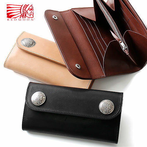 メーカー希望小売価格はメーカーカタログに基づいて掲載しています人気のラウンドファスナー式インナー仕様に 普遍的なボタン留めフラップ開閉を融合した新モデル ー ディアル 30mmコンチョ タイプー 結局のところ使い易い! 多種多様なスタイルがある中、何だかんだでで最も馴染みのある スナップボタン(2点留め)開閉を採用した新作ロングウォレットのご紹介。 サドルレザーの質感がダイレクトに伝わるスッキリとして精悍なフォルムに、 ラウンドファスナーウォレットの蛇腹開閉で人気の高いインナー仕様を組み合わせた、 今までに無かったスマート且つエレガントな新型モデル。 開閉フラップにはブランドのアイコンとなる、 ネイティブインディアンをデザインした少し大ぶりな30mmコンチョを左右に配置。 フラップのスナップボタンをパチンと外せば ガバッと大きく開き、大収納にして整理ポケットが豊富に装備。 両脇を囲われた構造から出し入れ時にこぼれ落ちる事もなく、 また大開きする事で非常に内容物の視認性も高く安心・快適な使い心地。 両側面にはカードポケットとその背面には札入れポケットを配置し・ (片面には2列2段+対向面には2列3段の合計10カードポケット) センターにジップ開閉の大型コインポケットがあり、 側面にはマチ無しのサブポケットも装備しました。 またこちらはインナーにもアウトシェル(外革)同様の素材で裏張りを贅沢に施しており、 見た目もボリューム感があり、職人の手仕事がより加わった重厚なクラフト感が魅力。 素材はブランドが自信を持ってお勧めする、 「オリジナルサドルレザー」を用いた絶品の素材感。 日々使い込みながら徐々に経年変化する レザーアイテム特有の醍醐味を是非体感してみては如何でしょうか。 自分だけの風合いを纏ったオンリーワンな逸品に仕上げる、 そんなモノへの愛着を感じるレザーライフをお約束します。 レザーウォレットの雄として君臨し、日本が誇る made in japan (メイドインジャパン)のレザークラフト。 熟練職人が一針一針丹念に作り込む独自のモノ創りと、 他にはない着想とユーザー目線で 世界中から多くの熱烈なファンを擁するREDMOON。 今までとは違う、他にない、本物のレザーアイテムをお届けします。 ラウンドファスナーでもミニウォレットでもないタイプをお探しの方に、 実は他では見かけなく、それでいてルックス・機能面で申し分のない、 性別を問わずマッチする重厚かつエレガントなロングウォレットです。 King of Wallet がモノ作りの追求の中で 進化発展させたバージョンアップインナー 進化するベーシック”をブランドコンセプトとして掲げる、 本物志向を追求し続けるレザーアイテム作りの精神。 その本質の一つとされる「機能とデザインの融合」を具現化した、 シンプルで使い易いスタンダードなインナー仕様。 それは日々の永年使用を想定し、熟練商人の手により形作られ、 まさにブランドの矜持を表す期待を裏切らない丁寧な仕上がりです。 日々のウォレット作りのノウハウを取り入れながら改良を加え進化した、 手にすればズバリ納得のREDMOONが誇るシン仕様です。 使い始めは未完成、長年の愛用で自分だけの逸品へ 同ブランドのオリジナルサドルレザーは、 革モノの醍醐味を最大限に体感してもらえるよう、 経験を基に考え抜き手間暇を掛け、 ”丁度良く”なめした革を使用しております。 日々の使用でいい具合に馴染み変化していくスピード感、 そして逸品になるべく永い使用に耐えうる耐久性。 Made in Japan を代表するレザーブランドとして 支持され続ける納得の理由がそこにはあります。