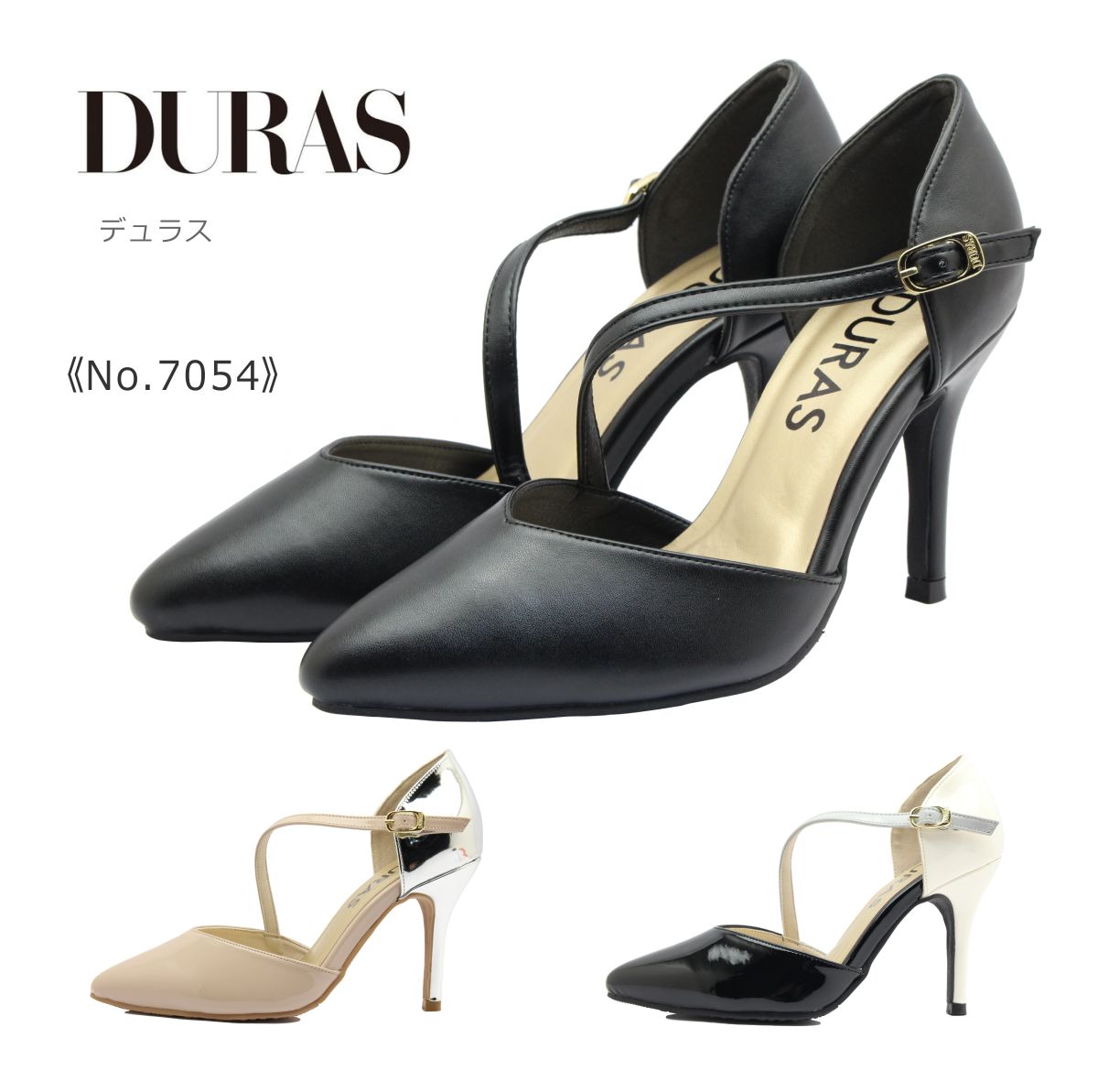 DURAS デュラス レディース パンプス DR 7054 ポインテッドトゥ ストラップ ヒール 靴 黒 ブラック エナメル ベージュ
