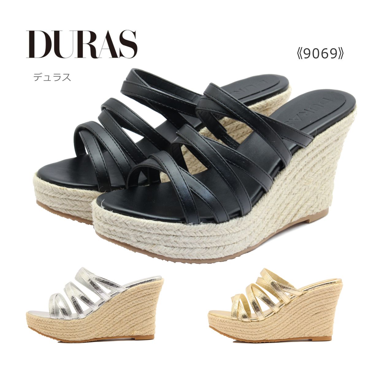 DURAS デュラス レディース ミュール DR 9069 サンダル ジュート 靴 黒 ブラック ゴールド シルバー 涼感のあるジュートソールが大人のリラックススタイルを演出するミュール。 アッパーはムレにくく女性らしい細めのストラップ仕様。 程よい高さのウェッジソールでスタイルアップ。 ■商品詳細 ・甲皮:合成皮革 ・底材:合成底 ・靴幅:2E ・ヒール高:約9.5cmDURAS デュラス レディース ミュール DR 9069 サンダル ジュート 靴 黒 ブラック ゴールド シルバー 涼感のあるジュートソールが大人のリラックススタイルを演出するミュール。 アッパーはムレにくく女性らしい細めのストラップ仕様。 程よい高さのウェッジソールでスタイルアップ。 ■商品詳細 ・甲皮:合成皮革 ・底材:合成底 ・靴幅:2E ・ヒール高:約9.5cm