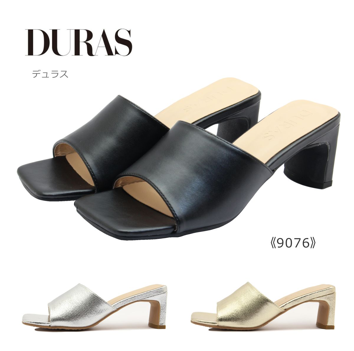 DURAS デュラス レディース ミュール DR 9076 スクウェア サンダル ヒール 靴 黒 ブラック ゴールド シルバー