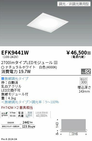 【仕様】●メーカー:遠藤照明●型番:EFK9822W●商品名:LEDスクエアベースライト●LEDZ FLAT BASEシリーズ●450シリーズ●埋込型●電源内蔵●FHP32W×4器具相当●11000lmタイプ●調光・非調光兼用型●無線調光タイプ●調光率(%):5〜100●光色:昼白色●色温度(K):5000●電圧(V):100〜242●消費電力(W):78.9●定格光束(lm):11038●演色(Ra):82●固有エネルギー消費効率(lm/W):139.8●LED光源寿命(h):40000●本体色:白●フラット乳白パネル●LED交換不可●LEDモジュール付●無線モジュール付●グリーン購入法適合品【ご注意】※取り付けには電気工事士の資格をもつ方の工事が必要となります。