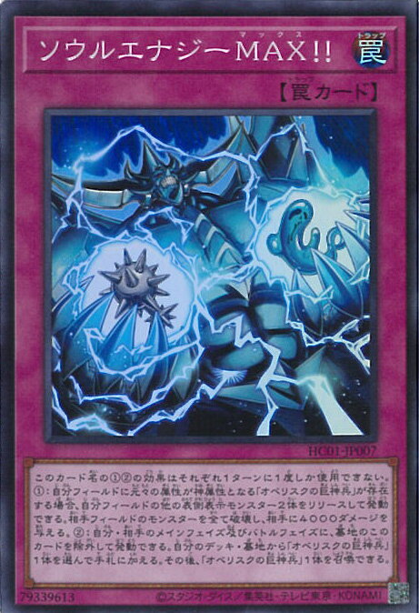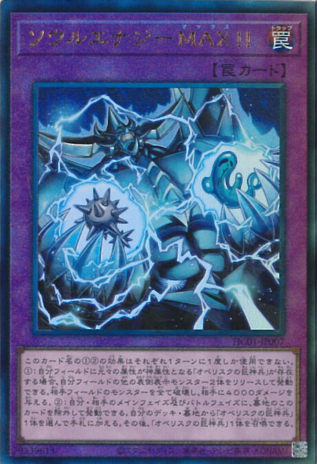 ★遊戯王 OCG デュエルモンスターズ 「HISTORY ARCHIVE COLLECTION(ヒストリー・アーカイブ・コレクション)」(HC01)収録 ■カード名:ソウルエナジーMAX!! 【通常罠】スーパーレア ■このカード名の(1)(2)の効果はそれぞれ1ターンに1度しか使用できない。 (1):自分フィールドに元々の属性が神属性となる「オベリスクの巨神兵」が存在する場合、 自分フィールドの他の表側表示モンスター2体をリリースして発動できる。 相手フィールドのモンスターを全て破壊し、相手に4000ダメージを与える。 (2):自分・相手のメインフェイズ及びバトルフェイズに、 墓地のこのカードを除外して発動できる。 自分のデッキ・墓地から「オベリスクの巨神兵」1体を選んで手札に加える。 その後、「オベリスクの巨神兵」1体を召喚できる。 【ID:79339613】★当店のシングルカードはデッキ,パック開封品です。100円以上または、レア以上のカードはカードプロテクター(スリーブ)にて管理保管されています。