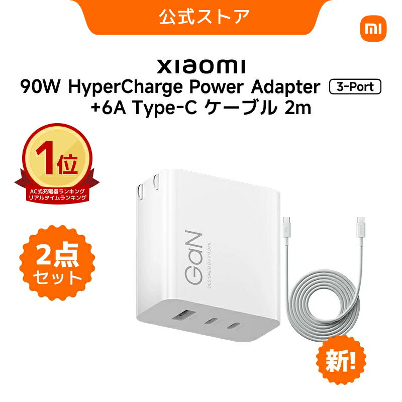 Xiaomi 90W HyperCharge Power Adapter (3-Port) : 製品名 Xiaomi 90W HyperCharge Power Adapter (3-Port) 製品寸法 55.5×74.8×30mm(プロングを除く) 製品重量 130g 製品の色 ホワイト 入力パラメーター 100–240V~、50/60Hz、2.0A ポートタイプ USB-Cポート×2、USB-Aポート×1 出力パラメーター シングルポート出力:USB C1/C2:5.0V-3.0A 15.0W、9.0V-3.0A 27.0W、15.0V-3.0A 45.0W、11.0V-6.1A 67.0W(最大)、20.0V-4.5A 90.0W(最大) USB A:5.0V-3.0A 15.0W、9.0V-3.0A 27.0W、12.0V-2.25A 27.0W デュアルポート出力USB C1+C2:67.0W(最大)+18.0W、USB C1/C2+A:67.0W(最大)+18.0W トリプルポート出力:USB C1+(C2+A):67.0W(最大)+15.0W 動作温度 -10°C~+40°C パッケージ内容 Xiaomi 90W HyperCharge Power Adapter (3-Port)×1 取扱説明書×1 Xiaomi 6A Braided USB-C to USB-C Cable: 製品名 Xiaomi 6A Braided USB-C to USB-C Cable 長さ 1m/2m 製品重量 27.3g/69.5g(包装および取扱説明書を除く) 主要外装素材 編み込みナイロン糸、TPE ポートタイプ USB 2.0 Type-C to Type-C 伝送速度 480Mbps 定格電流 6A カラー ホワイト ケーブル直径 3.8mm/4.0mm パッケージ内容 Xiaomi 6A Braided USB-C to USB-C Cable×1、 保証のお知らせ×1、 パッケージ×1