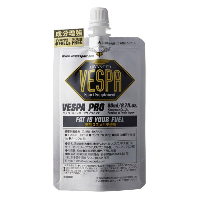 モニターやPC環境により、 色の見え方が実際の商品と異なることがございます。 メーカー希望小売価格はメーカーサイトに基づいて掲載しています ご参考下さい。メーカーサイズ表になります。 <★在庫は店舗・メーカーと共有の為、完売の際は予めご了承下さい。> <メーカーお取り寄せの場合> メーカーから当店に入荷するまで通常で約2~3日が目安になります。(土・日・祝日除く) 体脂肪を燃焼させる効果が有ると学会で発表されたスズメバチの栄養液を原料に、限界に挑むトップアスリートが、ここ一番の勝負のために、安心して摂れるサプリメントを目指し、開発されたのがVESPA PROです。 これまでに、多くのアスリートの偉業を支えてきた製品です。 原材料名はちみつ、スズメバチ抽出液、生ローヤルゼリー、プロポリス(ブラジル産)、ビタミンC、クエン酸 内容量80ml