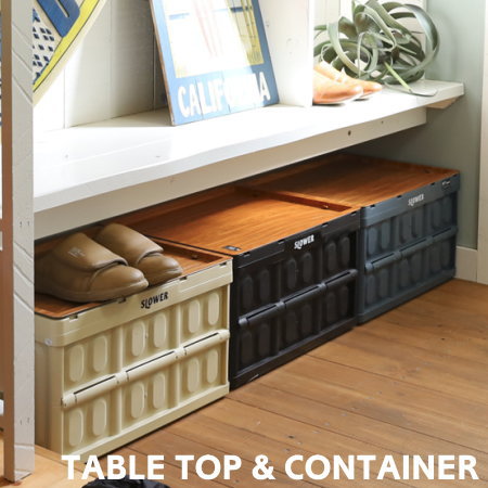 CONTAINER+TABLE TOP 折りたたみコンテナ + テーブルトップ 工場のコンテナーをアレンジさせたような雰囲気のテーブルトップ付きフォールディングコンテナです。 とにかく丈夫で部屋での使用はもちろんアウトドアでも活躍します。 SIZE 【コンテナ】 外寸:幅525×奥行360×高さ295mm 約1550g 内寸:幅485×奥行320×高さ280mm 折りたたみ時:幅525×奥行360×高さ68mm 【テーブルトップスティア】 幅520×奥行355×高さ15mm MATERIAL 【フォールディングコンテナ】ポリプロピレン(PP) 【テーブルトップスティア(木目プリント)】ポリプロピレン(PP) 、塩化カーボネイト 備考 *積載物耐荷重:10kg *積上耐荷重:50kg *容量:45LCONTAINER+TABLE TOP 折りたたみコンテナ + テーブルトップ 工場のコンテナーをアレンジさせたような雰囲気のテーブルトップ付きフォールディングコンテナです。とにかく丈夫で部屋での使用はもちろんアウトドアでも活躍します。 フォールディングコンテナとテーブルトップのセットです。テーブルトップはコンテナの上に置くだけの仕様で簡単にセットできます。 フォールディングコンテナはテーブルトップを外して45Lの大容量な収納ボックスとして便利です。水にも強い素材ですのでアウトドアやスポーツ時の収納ボックスとしてもOK。 テーブルトップをフォールディングコンテナの上にセットすると蓋としてはもちろんテーブルとしても使えて便利ですよ。 部屋だけの使用だけでなくどんどんアウトドアにも連れ出してください。スタッキングして積み重ねる事ができるところも便利ポイントですね。(5段以上の積み重ねは不可) 使用しない時は折りたたんでコンパクトに収納する事ができますよ *テーブルトップスティアは製品の特性上歪みが生じている物もございますが、 エストリル(コンテナ)にセットする事でフラットな状態になり問題なくご使用頂けます。 1)工場のコンテナーをアレンジさせたような雰囲気。 2)本体はとにかく丈夫。 3)45Lと大容量で雑貨の収納に便利。 4)水にも強い素材でアウトドアでの収納ボックスとしても。 5)使わない時はコンパクトに収納可能。 SIZE 【コンテナ】 外寸:幅525×奥行360×高さ295mm 約1550g 内寸:幅485×奥行320×高さ280mm 折りたたみ時:幅525×奥行360×高さ68mm 【テーブルトップスティア】 幅520×奥行355×高さ15mm MATERIAL 【フォールディングコンテナ】ポリプロピレン(PP) 【テーブルトップスティア(木目プリント)】ポリプロピレン(PP) 、塩化カーボネイト 備考 *積載物耐荷重:10kg *積上耐荷重:50kg *容量:45L