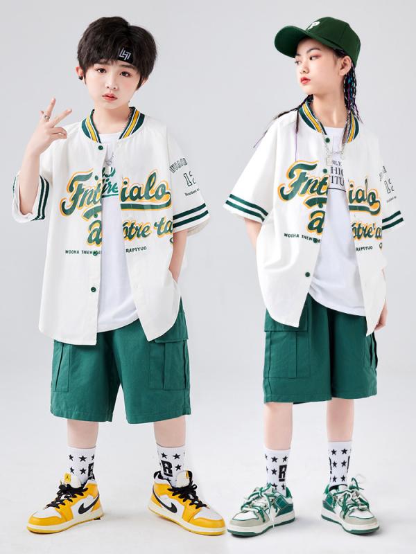 ダンス衣装 キッズ 男女兼用 ヒップホップ 半袖ベースボールジャケット ショートパンツ セットアップ 子供 舞台演出服 ジュニア ストリート 綿 春夏