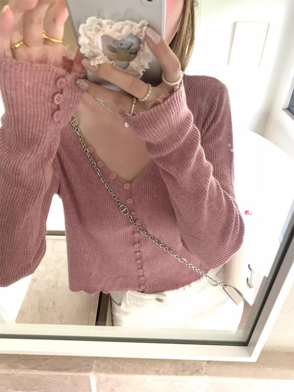 ・カテゴリ: ニット・素材: ポリエステル混紡・柄: 無地・厚さ: 薄手・スタイル: プルオーバー、カーディガン・シルエット: レギュラー・袖丈: 長袖・ネックライン: Vネック・着丈: 短め(40cm<着丈≤50cm)・装飾: ボタン・カラー: グレー、ピンク、ベージュ・サイズ: S、M、L・テイスト: カジュアル、リラックス