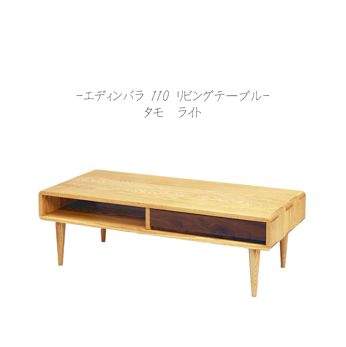 材質:タモ無垢材・ウォールナット無垢材 オイル塗装 サイズ:W1100*D500*H365mm 無垢材を活かした意匠と構造で、丸みを帯びた柔らかなデザインが特徴です。 人体に優しい健康家具として、安全性の高い材料を使用しています。 ライト・ダーク色の2色からお選びいただけます。 木製商品の為、杢目や色味にWEB上の画像と若干の違いがありますが、自然素材の為ご了承ください。 メーカーの意向により、予告無くデザイン変更・又は生産終了となる場合がございますので、予めご了承ください。 在庫のタイミングによってはお届けにお時間かかる場合もございます。 スツール等の組立はホゾ構造で作成しております 貫通した上からクサビを打ち込み、 しっかりと組み上げています。 クサビも意匠と捉え、あえて見える様に 処理をしております。 ラックや収納家具はロッキング構造を採用しています。 木材は呼吸する物、 湿度や気温の変化によって、木が呼吸し動いたり変形する場合があります。 素材の良さを活かす為、木材同士を組み合わせて、自然に呼吸し、 それでいてしっかり強度を持たせる様、こだわりを持って作成しています。 木のぬくもりあふれるリビングテーブルです。 優しい杢目のタモ材と、上品な杢目のウォールナット材を組み合わせて仕上げました。 無垢材の風合いを活かす様、オイル塗装で仕上げました。 堅牢なロッキング構造でつなぎ合わせており、耐久性もバッチリ! 2種類の木材のコンビネーションがデザインのアクセントになっています。 角を丸く削り出したデザインも無垢材ならではのポイントです。緩やかな丸みが柔らかさをイメージしています。 引出は前後両面使用になっていますので、どちら側からも引き出せます。 片側はオープンですが、引出の左右差し替えも可能です。 脚木はねじ込み式なので取付も簡単です。 家具の事なら何でもお気軽にお問い合わせください。
