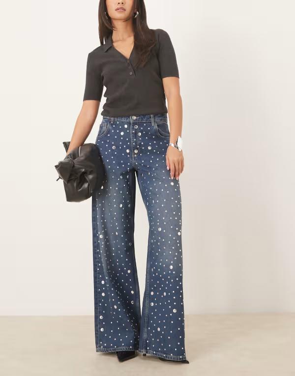 マンゴ レディース ボトムス デニムパンツ ストレート コットン ジーンズ Mango Elina 100% cotton straight leg jeans with embellishments BLUE ブルー
