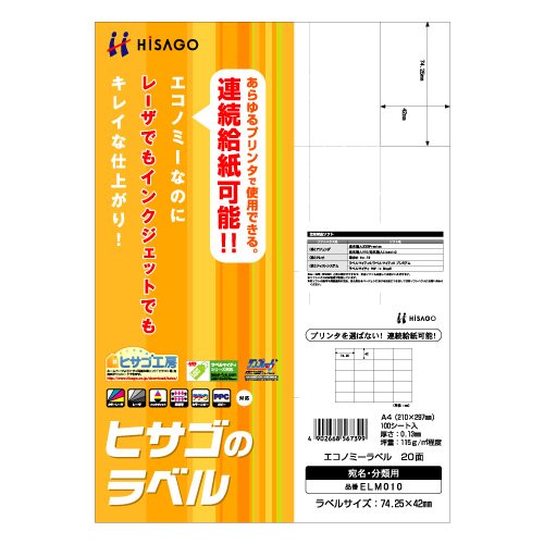 ヒサゴ ELM010S エコノミーラベル 20面 30シート ◆入数:30シート◆ラベルのみの厚さ:0.10mm◆サイズ:A4 210×297mm◆ラベルサイズ:74.25×42mm◆面付け:20(4×5)◆紙厚:0.15mmエコノミーラベル 20面各種プリンタ(レーザ・インクジェット・コピー機)でマルチに印刷可能。カラーレーザプリンタ、カラーコピー機にも対応しています。連続給紙が可能宛名ラベル、商品ラベル、生産者ラベルなどに便利なサイズです。剥離紙(台紙)は樹脂ラミネート加工をしていませんので、そのまま雑誌古紙としてリサイクルできます。レーザプリンタ・コピー機によっては(特に「厚紙」設定がない機種では、トナーが定着しにくい場合があります。 塗りつぶし面積が大きい場合、ムラが出ることがあります。各種プリンタ(レーザ・インクジェット・コピー機)でマルチに印刷可能。カラーレーザプリンタ、カラーコピー機にも対応しています。連続給紙が可能宛名ラベル、商品ラベル、生産者ラベルなどに便利なサイズです。剥離紙(台紙)は樹脂ラミネート加工をしていませんので、そのまま雑誌古紙としてリサイクルできます。