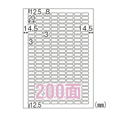 ヒサゴ ELM038 エコノミーラベル 200面 角丸 100シート ◆入数:100シート◆ラベルのみの厚さ:0.10mm◆サイズ:A4 210×297mm◆ラベルサイズ:20×8mm◆面付け:200面(8×25)◆紙厚:0.15mmエコノミーラベル 200面 角丸各種プリンタ(レーザ・インクジェット・コピー機)でマルチに印刷可能。カラーレーザプリンタ、カラーコピー機にも対応しています。連続給紙が可能なので、大量に印刷したい場合にも便利です。レーザプリンタ・コピー機によっては(特に「厚紙」設定がない機種では、トナーが定着しにくい場合があります。 塗りつぶし面積が大きい場合、ムラが出ることがあります。各種プリンタ(レーザ・インクジェット・コピー機)でマルチに印刷可能。カラーレーザプリンタ、カラーコピー機にも対応しています。連続給紙が可能なので、大量に印刷したい場合にも便利です。