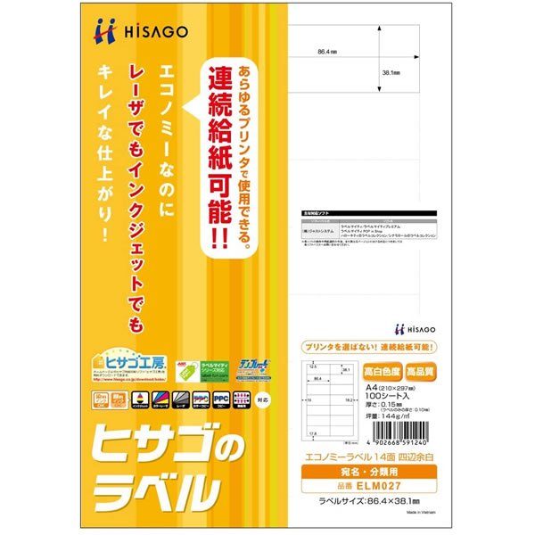 ヒサゴ/エコノミーラベル 14面 四辺余白 (ELM027) 100シート HISAGO