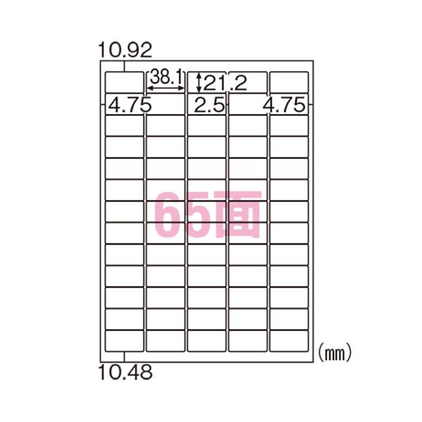 エコノミーラベル65面●規格:A4判65面●1片寸法:縦21.2×横38.1mm●紙種:上質紙●総紙厚:0.15mm