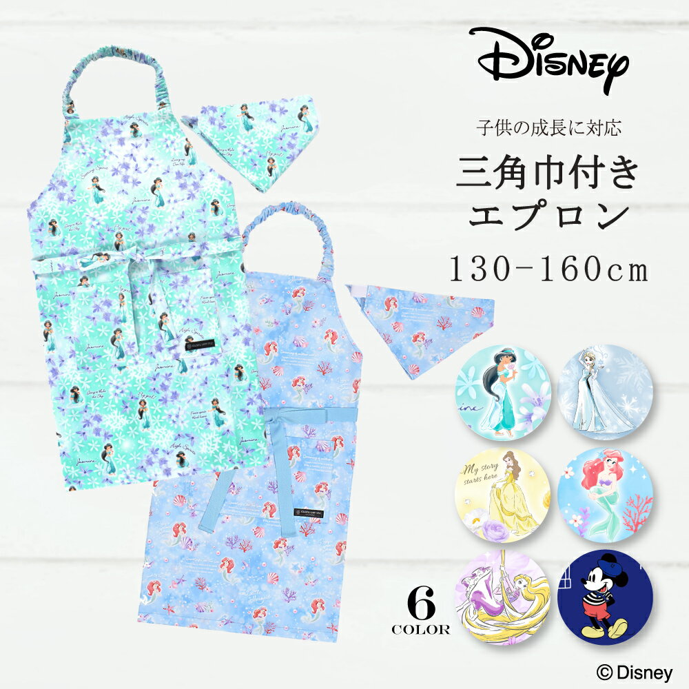 【2点セット】 ディズニー エプロン キッズ 三角巾 セット 女の子 男の子 子ども キッズエプロン プリンセス エルサ ベル ラプンツェル アリエル 子供 三角巾つき ゴム 可愛い こども 130 140 150 160