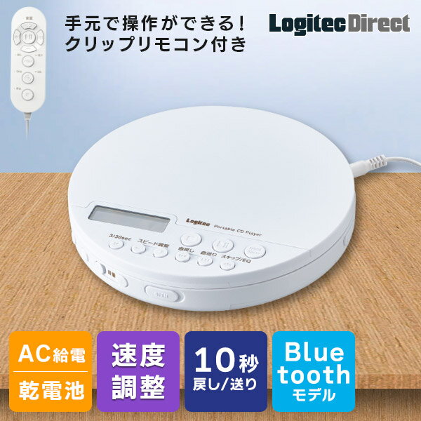 ロジテック CDプレーヤー Bluetooth 搭載 手元リモコン付き ポータブル 語学学習 ワイヤレス 卓上 CDプレイヤー コンパクト 英語 勉強 リスニング リピート機能 再生速度調整 遅聴き/早聴き アナログ出力 簡単操作 【LCP-PAPB02WHLWD】