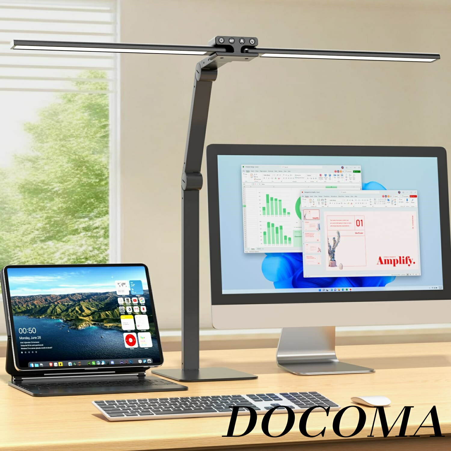 適格請求書登録取得。可動域が広く、関節の柔軟性が高い:デスクライトのアームは連結部が2つあり、それぞれ縦方向への首振りが225度の範囲に調整可能です。机に固定するクランプすぐ上が360度回転可能できません。ダンパーは若干硬いので、望む位置に止めることは簡単です。使いやすさと安定感を求める人は「スタンド式」:スタンドタイプは机の上に置いて使用するタイプです。設置が簡単で、鉄製のスタンドのサイズは22CM*17CMで、非常に安定感があります。組み立てる手順は詳細ページの写真と動画を参考してください。デスクライトは使用可能の高さの範囲は59CMまでです。2本の可動式バー型ライト:40CMのバー型ライトは2本搭載されており、T字、V字、I字にも設定可能で影ができない。デスクライトのセード(光源)が80cmと長く、左右に分かれており、最大180度可動式のライトでデスクを幅広く照らすことができ、色々な用途に使える。操作のしやすいタッチパネル:前面に位置するタッチパネルは直感的でわかりやすく、電源オン・オフと30分タイマー、色温度4段階(2,700K~6,000K)、明るさ4段階(25%~全光量)、光センシング(周囲の明るさに応じて自動調光)の4つのボタンで調整できます。また、メモリー機能を搭載しているため、ランプ消灯からの点灯であれば同じ設定で照らしてくれます。