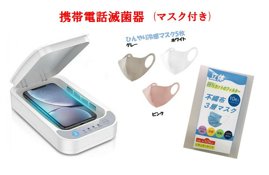 紫外線 ランプ 紫外線照射機 UVCライト 照射方法はとっても簡単! スマホを「スマートクリーナー」のBOX内にセットして、ボタンをON。 「約6分間」というわずかな時間、UVライトを照射するだけで「99%以上」除去できます。 ランプは25%、50%、75%、100%を示しており、わずかな時間でも効果はありますが、10分間経つと照射が完了し、sterilizationボタンを2回押すと電源が消えます。 使い方: 携帯電話を多機能コーティング機に入れます。 コーティングボタンを押します。 コーティングを開始し、紫外線照射が終了します。 アロマ状態の場合、アロマボタンを押すと、アロマ機能が自動的に開始されます。 安全指示: ユニットを炎、水、腐食性化学物質から遠ざけてください ユニットを有機溶剤で洗浄しないでください 紫外線照射を長時間見つめないでください 生産の特徴: ユニットの寸法:218x122x53 mm Ibberキャビティの寸法:180x100x22 mm 最大容量:6インチの携帯電話 入力電圧:DC 5V 入力電流:1-2A 力(拡散):1W 電力:2W 最大電力:9ワット 紫外線波長:253.7 mm パッケージリスト: 本体×1 マイクロUSBケーブル×1 ※デザインは除菌状況のわかるランプ付きと付いてないもの、 どちらかのランダム発送となります、ご了承お願い致します ≪マスクの種類をお選びください≫ ・ひんやり冷感マスク 5枚 フリーサイズ グレー/ホワイト/ピンク ☆生地は夏に向けて最適 接触冷感。10回程以上洗える繰り返し使用でき、エコにもつながります。 ・不織布3層マスク 10枚入り レギュラーサイズ ホワイト ☆3枚重ねフィルターで花粉やホコリなどのミクロ粒子をしっかりカットします。