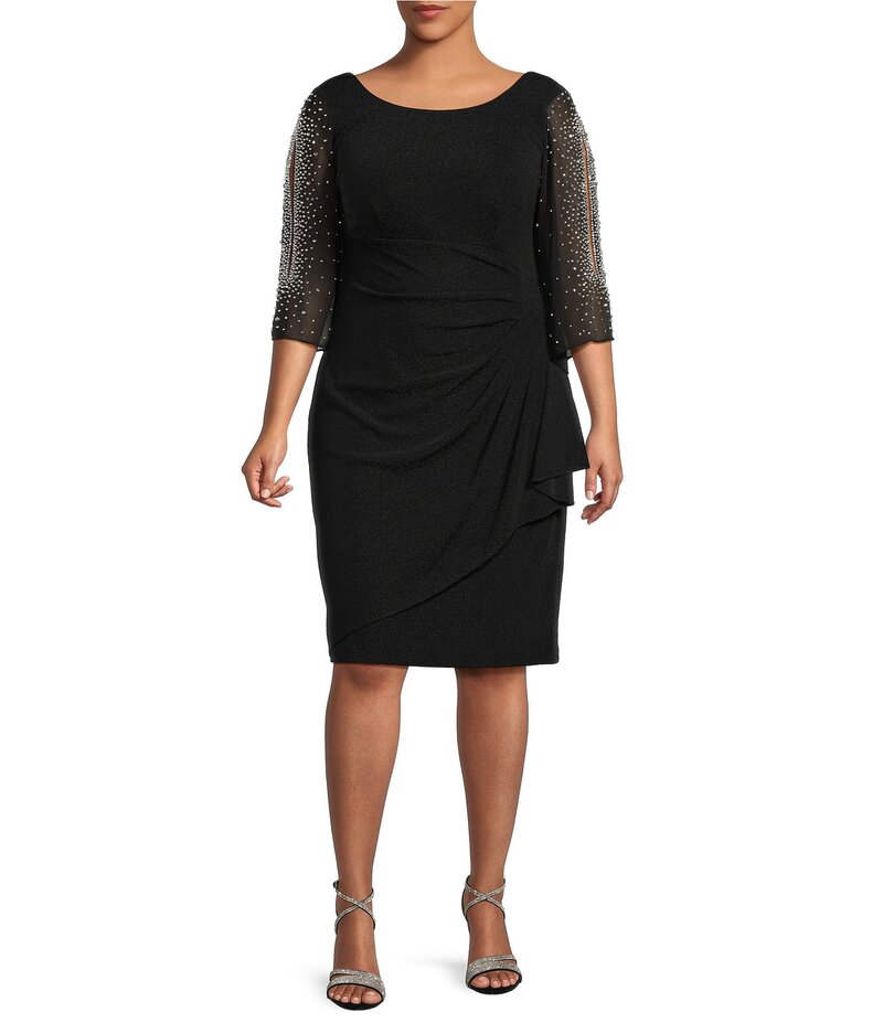 アレックスイブニングス レディース トップス ワンピース プラスサイズ トール ニット Alex Evenings Plus Size Cowl Neck 3/4 Beaded Illusion Sleeve Metallic Knit Sheath Dress Black ブラック