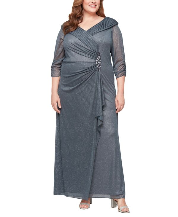 アレックスイブニングス レディース トップス ワンピース A ライン プラスサイズ Alex Evenings Plus Size Long Portrait Collar Glitter Smoke 3/4-Sleeve A-Line Dress Smoke スモーク