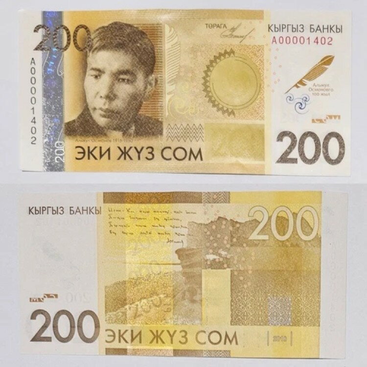 キルギスタン 200ソム 2010 32ペンス 生誕100周年記念 オスモノフUNC新紙幣
