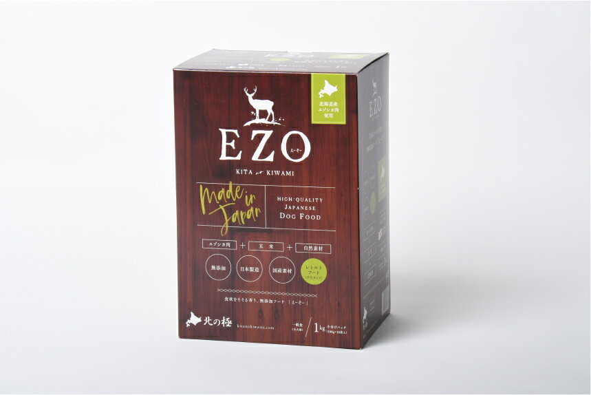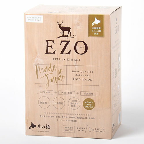北の極 EZO 療法食 エーゾー えーぞ 1kg(100g×10P) ドッグフード 犬の一般食 成犬用 無添加 国産 エゾシカ肉 玄米 国産野菜等を使用 エゾシカ肉を使った無添加フード! エゾシカ肉と穀物、野菜をバランスよく配合した無添加の一般食です 食欲をそそる香りと、エゾシカ肉を使った無添加フード!「EZO(えーぞー)」は、ドライフードのように乾燥させない、加圧加熱殺菌処理(レトルトパック)を行うことにより、素材の風味と水分量を保持したまま、無添加で保存できるレトルトフードです。レトルトパックにすることで、「EZO」はすべての添加物、着色料、調味料、防腐剤、酸化防止剤など一切使用していないため、安心して与えられます。ドライフードを食べない、好き嫌いの激しいワンちゃんにも適しています。一般のペットショップで販売されている、総合栄養食ではありません。エゾシカ肉と穀物、野菜をバランスよく配合した無添加の一般食になります。【エゾシカ肉】鹿肉は良質なタンパク源。脂肪分も少なく、必須脂肪酸やアミノ酸、ビタミン、ミネラルを豊富に含んでいます。お肉では珍しい、DHAやCLA(共役リノール酸)をバランスよく含んでいます。【食物アレルギーに配慮しています】高タンパク・低脂肪・エゾシカ肉使用でお肉のアレルギーのワンちゃんに配慮しています。(玄米・大麦のアレルギーの方は注意です。) アミノ酸、ビタミン、ミネラルを豊富に含んでいる。 私たち人間が食べる素材と同じものを使用。 原材料段階から添加物は一切使用しない。 1