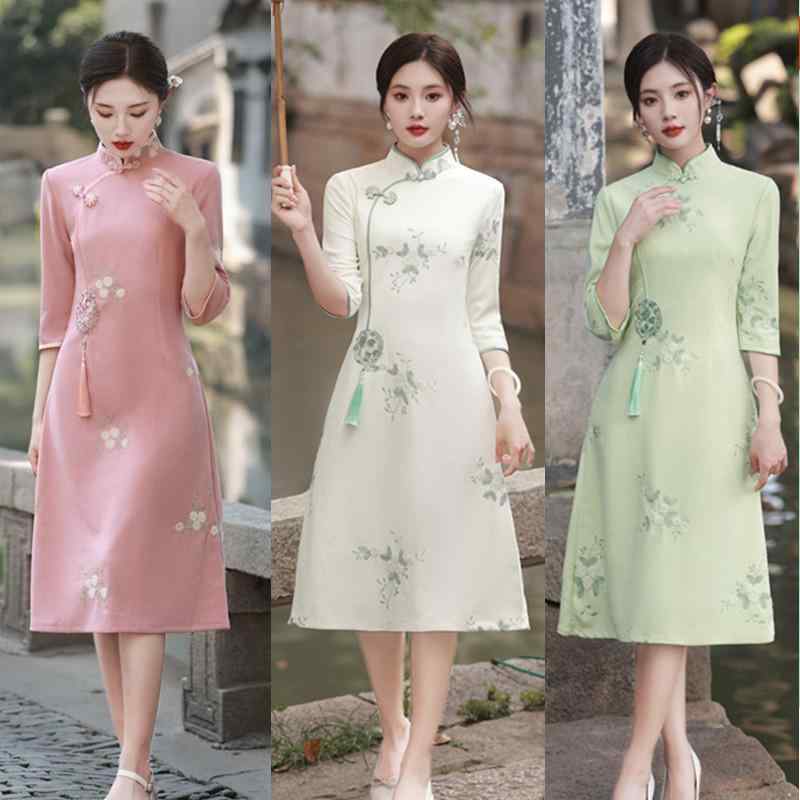 ・カテゴリ: チーパオ・スタイル: 文芸レトロ・主な素材: ポリエステル約80-90%、シェニール刺繍・ネックライン: スタンドカラー・襟: 斜め襟・袖丈: 七分袖・丈: ミドル丈・ディテール: ジッパー・加工: パイピング・伸縮性: 微ストレッチ・対象: 大人・性別: 女性・カラー展開: ピンク、グリーン、アプリコット・サイズ展開: S、M、L、XL、XXL、XXXL