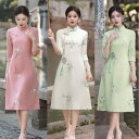 ワンピース レディース 女性用 モダンチャイナ風 チャイナドレス 改良 Aライン 上品 エレガント レトロ クラシック シェニール刺繍 ポリエステル 七分袖 立襟 秋冬