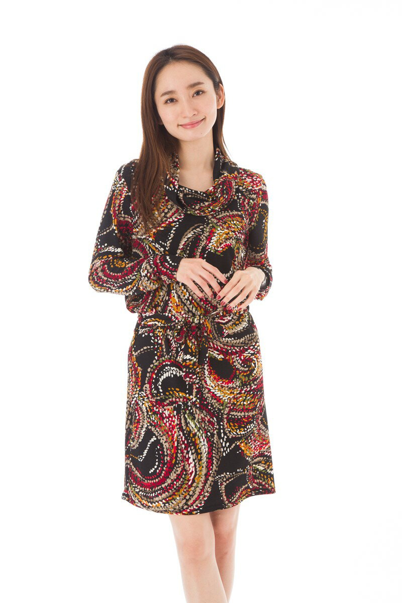 【SALE】メール便送料込 ファス(FAS)ワンピース T1 T3サイズ 長袖 ひざ丈 オフタートルネック 総柄 大人上品ワンピース レディース 大きいサイズ