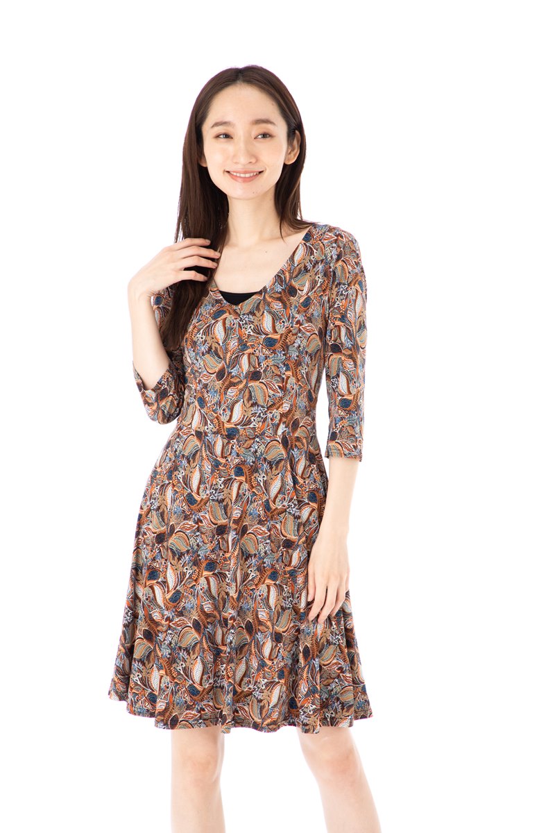 【SALE】メール便送料込 ファス(FAS)ワンピース T2 T3 T4サイズ 七分袖 ひざ丈 リーフ柄 Vネック 大人上品ワンピース レディース Fille A Suivre