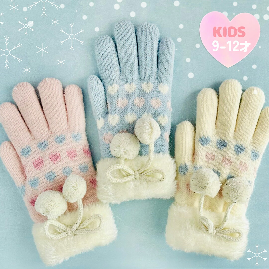 ポンポン リボン ニット 手袋 女の子 かわいい 小学生 高学年 裏起毛 てぶくろ 子供 こども 子ども 女子 通学 防寒 防寒具 誕生日 プレゼント クリスマス グローブ 手ぶくろ 小3 小4 小5 小6