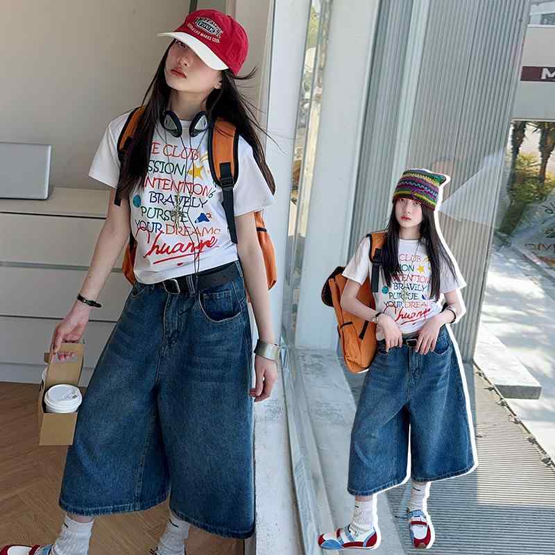 ・対象: 女の子・スタイル: 韓国・セット内容: パンツ、トップス・枚数: 2枚・対象年齢: 8歳以上・シーズン: 夏・袖丈: 半袖・パンツ丈: 七分丈・生地加工: 柔らか обработка、酵素洗い・厚さ: 薄手・柄: 文字・素材: デニム・主要生地: ポリエステル70%・安全レベル: B・トップス: プルオーバー・カラー: Tシャツ、パンツ・対応身長: 120cm、130cm、140cm、150cm、160cm、170cm・カテゴリー: 子供用セットアップ