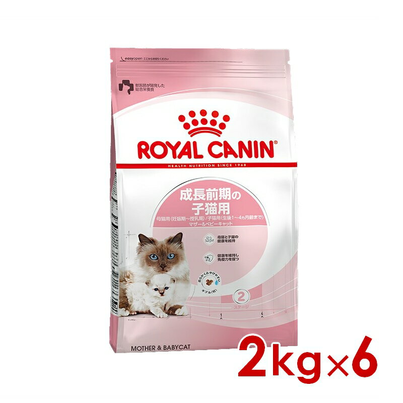 ※この商品はドライフード+ウェットフードのアソートセットです。セット内容(1)ロイヤルカナン マザー&ベビーキャット 2kg(2)ロイヤルカナン ウェット マザー&ベビーキャット 100g×12袋商品の特徴健康な猫のための総合栄養食真性の肉食動物である猫にとって、基本的な栄養バランスは高タンパク質・低炭水化物です。また、必ず食事から摂取しなければならないタウリン・アラキドン酸・ビタミンAを始め、猫が必要とする栄養バランスは独特です。更に、年齢やライフステージによって猫が必要とする栄養バランスは異なるため、猫が必要とする栄養の特性と年齢の両方に配慮したフードを選んであげることが重要です。フィーライン ヘルス ニュートリションは、猫が必要とする栄養の特性と年齢に配慮した総合栄養食です。生後4ヵ月齢までの急激に成長する成長前期、生後4ヵ月齢から生後12ヵ月齢までのゆるやかに成長する成長後期、12ヵ月齢以上の成猫期、7歳からの中高齢期、12歳以上の高齢期のラインアップで、愛猫の生涯の健康をサポートします。【マザー&ベビーキャット ドライ】●母猫と子猫の健康をサポート<マザー&ベビーキャット>は、妊娠後期から授乳期における母猫の高いエネルギー要求量を満たす特別な栄養設計で、成長前期の子猫の健康をサポートします。●健康的に免疫力をサポートビタミンEとCなど科学的に証明された独自の抗酸化成分を配合し、子猫の健康を維持し、免疫力の発達をサポートします。●健康的な脳の発達をサポートオメガ3系不飽和脂肪酸(DHA)を配合し、子猫の健康的な脳の発達と視力をサポートします。●健康的な腸内細菌バランスをサポートプレバイオティックス(マンナンオリゴ糖)と高消化性タンパク質の組み合わせが、健康的な消化を維持し、腸内細菌バランスを整えます。【マザー&ベビーキャット ウェット】●ウルトラ ソフト ムース●離乳期の子猫のために離乳期の子猫が食べやすいムース状で、母乳から離乳食への移行をスムースにします。●猫が本能的に求める栄養バランス猫が本能的に求める栄養バランスを追求。●健康を維持することで自然の抵抗力を維持離乳期の子猫の自然の健康を維持することで自然の抵抗力を維持します。成分・栄養素【マザー&ベビーキャット ドライ】[原材料]肉類(鶏、七面鳥、ダック)、動物性油脂、米、超高消化性小麦タンパク(消化率90%以上)、コーンフラワー、加水分解タンパク(鶏、七面鳥、魚)、酵母および酵母エキス、ビートパルプ、植物性繊維、大豆油、魚油(オメガ3系不飽和脂肪酸〔EPA+DHA〕源)、フラクトオリゴ糖、加水分解酵母(マンナンオリゴ糖及びβーグルカン源)、藻類油(DHA源)、マリーゴールド(ルテイン源)、アミノ酸類(L-リジン、タウリン、DL-メチオニン)、ゼオライト、β-カロテン、ミネラル類 (Cl、K、Ca、P、Na、Zn、Mn、Mg、Fe、Cu、Se、I)、ビタミン類 (コリン、E、C、ナイアシン、ビオチン、B2、A、パントテン酸カルシウム、B6、B1、B12、葉酸、D3)、酸化防止剤(ミックストコフェロール、ローズマリーエキス)[保証成分]たんぱく質:32.0%以上、脂質:23.0%以上、粗繊維:2.8%以下、灰分:8.4%以下、水分:6.5%以下、食物繊維:6.2、ビタミンA:29000IU、ビタミンD3:1000IU、ビタミンE:540mg[エネルギー]442kcal/100g[原産国]韓国【マザー&ベビーキャット ウェット】[原材料]肉類(鶏、七面鳥、ダック)、動物性油脂、米、超高消化性小麦タンパク(消化率90%以上)、コーンフラワー、加水分解タンパク(鶏、七面鳥、魚)、酵母および酵母エキス、ビートパルプ、植物性繊維、大豆油、魚油(オメガ3系不飽和脂肪酸〔EPA+DHA〕源)、フラクトオリゴ糖、加水分解酵母(マンナンオリゴ糖及びβーグルカン源)、藻類油(DHA源)、マリーゴールド(ルテイン源)、アミノ酸類(L-リジン、タウリン、DL-メチオニン)、ゼオライト、β-カロテン、ミネラル類 (Cl、K、Ca、P、Na、Zn、Mn、Mg、Fe、Cu、Se、I)、ビタミン類 (コリン、E、C、ナイアシン、ビオチン、B2、A、パントテン酸カルシウム、B6、B1、B12、葉酸、D3)、酸化防止剤(ミックストコフェロール、ローズマリーエキス)[保証成分]たんぱく質:32.0%以上、脂質:23.0%以上、粗繊維:2.8%以下、灰分:8.4%以下、水分:6.5%以下、食物繊維:6.2、ビタミンA:29000IU、ビタミンD3:1000IU、ビタミンE:540mg[エネルギー]442kcal/100g[原産国]オーストリア---------------------リニューアルについてメーカーからのリニューアルにより、予告なく仕様(パッケージ・原材料・生産国等)が変更される場合があります。また、在庫切り替えのタイミングによっては新旧商品が混在する場合がございます。ご了承ください。転売による注文のキャンセルについて当社が転売にあたると判断した場合(直送転売を含む)は、ご注文のキャンセル及び今後一切のご注文をお断りさせて頂く場合がございます。大量注文・個数制限品の複数注文等のキャンセルについて購入制限を設けている商品の複数回注文、同一商品の大量注文につきましては転売や事故等の防止の為、キャンセル処理とさせ