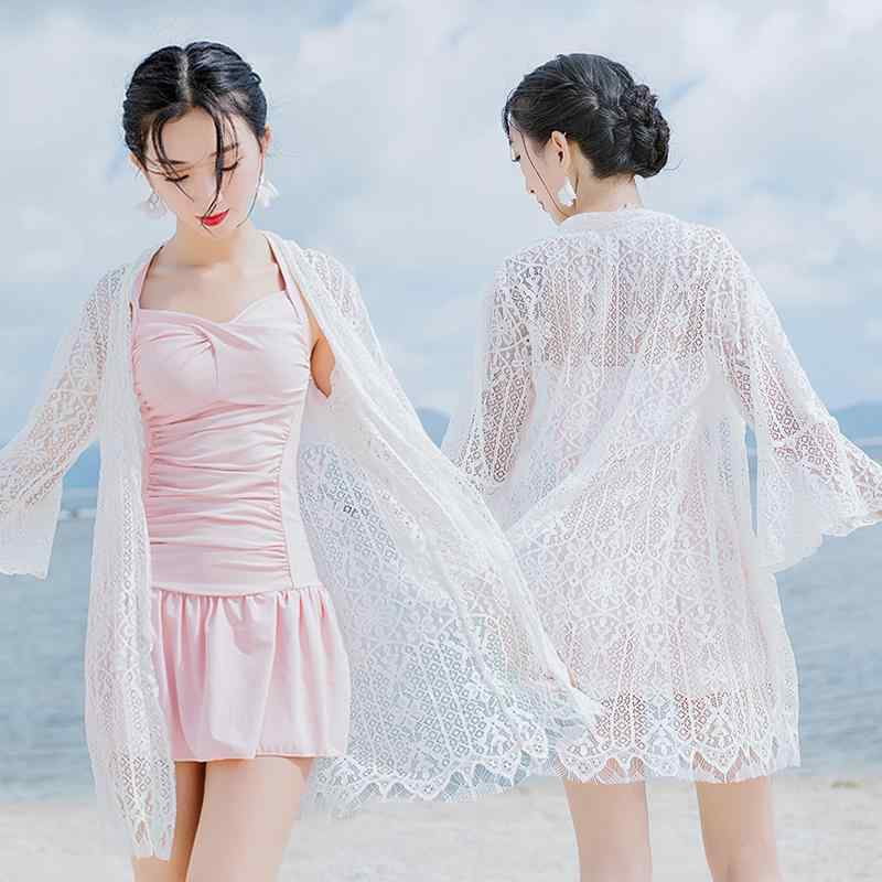 ミドル丈 シフォン レースカーディガン 日焼け防止 ゆったり 薄手 羽織物 ビキニアウター 長袖 フレア袖 軽量 カバーアップ 七分袖 カジュアル トランペットスリーブ