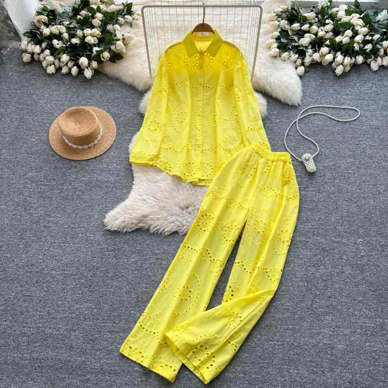 セットアップ パンツスーツ 女性用 ファッション シャツスーツ リラックス 刺繍 ゆったり 長袖 ワイドレッグストレートパンツ レディース おしゃれ カジュアル 通勤 休日 レジャー リゾート バカンス 旅行 デイリーユース