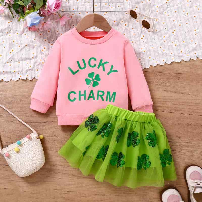キッズ 女の子 2点セット 春物 かわいい 綿混 柔らかい 長袖 ピンク セントパトリックデー 四葉のクローバー チュール プリンセスドレス ロゴプリント トレーナー