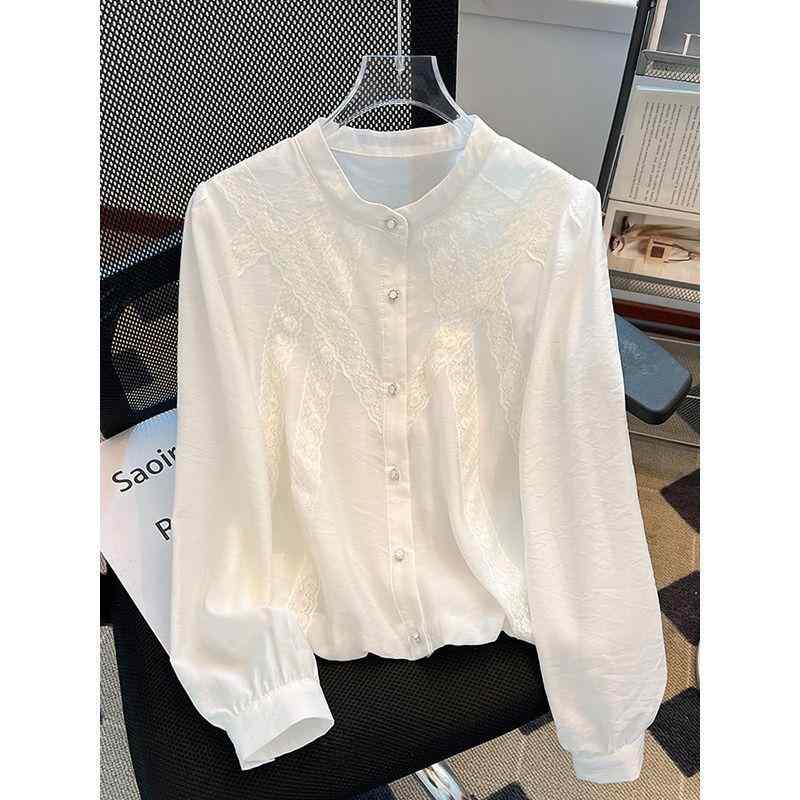 シャツ レディース スタンドカラー レース 長袖 ブラウス 白 高級感 ライトラグジュアリー 若見え 上品 エレガント 通勤 オフィス 無地 切り替え 春夏 トップス