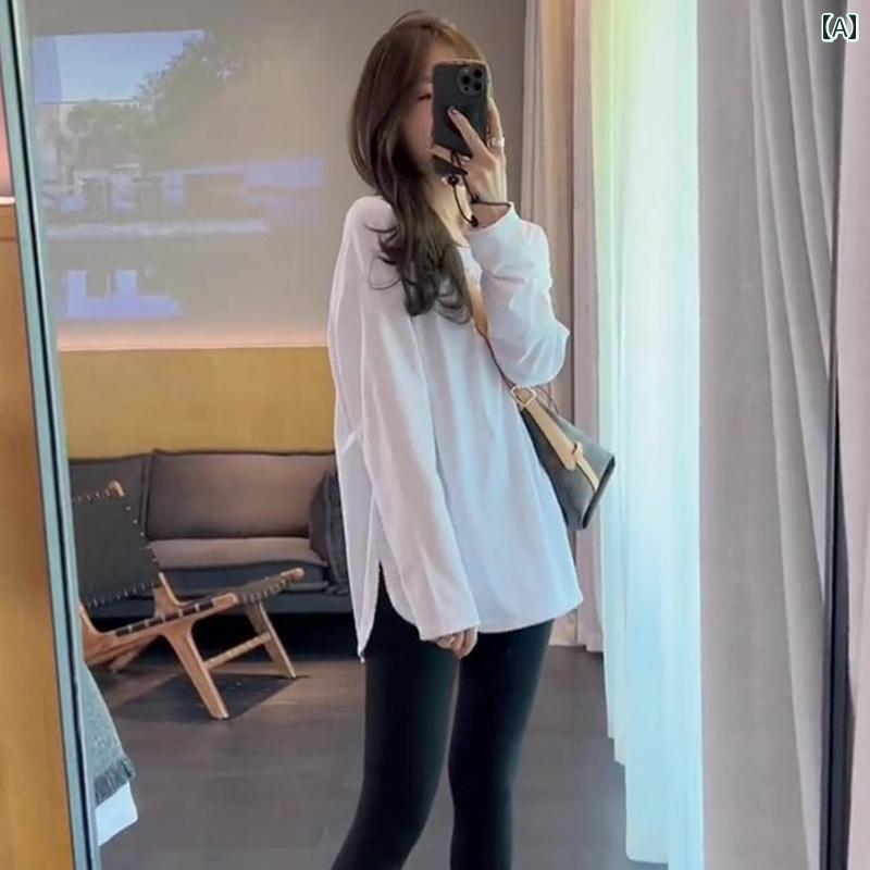 レディース トップス シンプル おしゃれ ホワイト 長袖 Tシャツ ゆったり 丈 インナー レイ ヤード ホワイト エッジ ボトム 秋