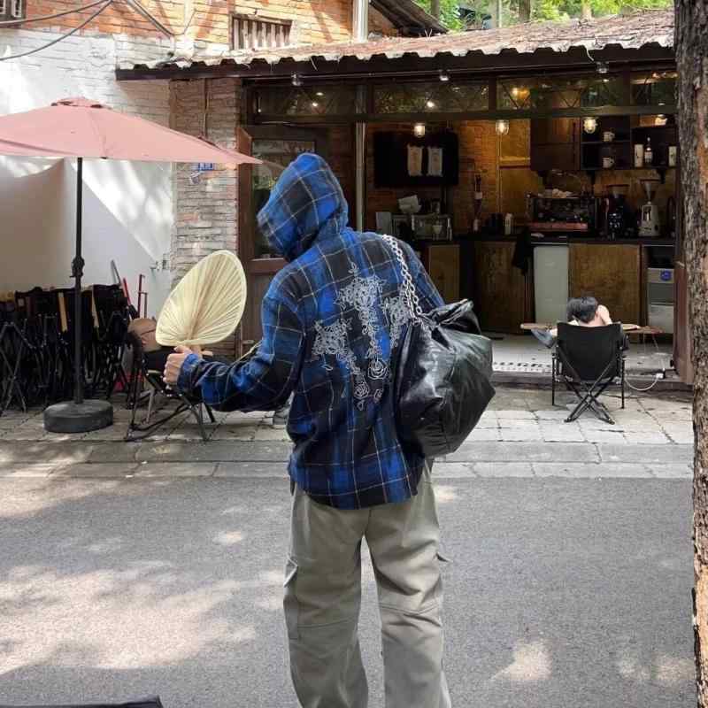 シャツジャケット メンズ アメリカン レトロ ルーズフィット 着痩せ効果 フード付き チェック柄 長袖 ポリエステル 通気性 吸湿速乾 耐摩耗性 シワになりにくい ブルー