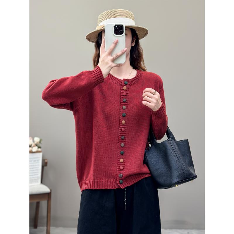ニット カーディガン レディース 秋冬 クルーネック 長袖 パフスリーブ カラフルボタン レトロ カジュアル 上品 きれいめ 着回し 羽織り