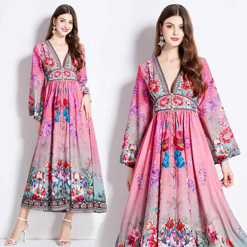 ワンピース レディース 早春 Vネック 長袖 パフスリーブ ウエストマーク プリント ロング丈 エレガント レトロ クラシカル ローズレッド リゾート