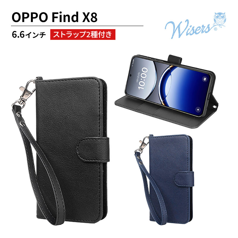 wisers OPPO Find X8 ケース 手帳型 スマホケース 対応 ストラップ 2種付き ( ハンドストラップ / ネックストラップ ) 2024 2025 年 新型 全2色 ブラック・ダークブルー