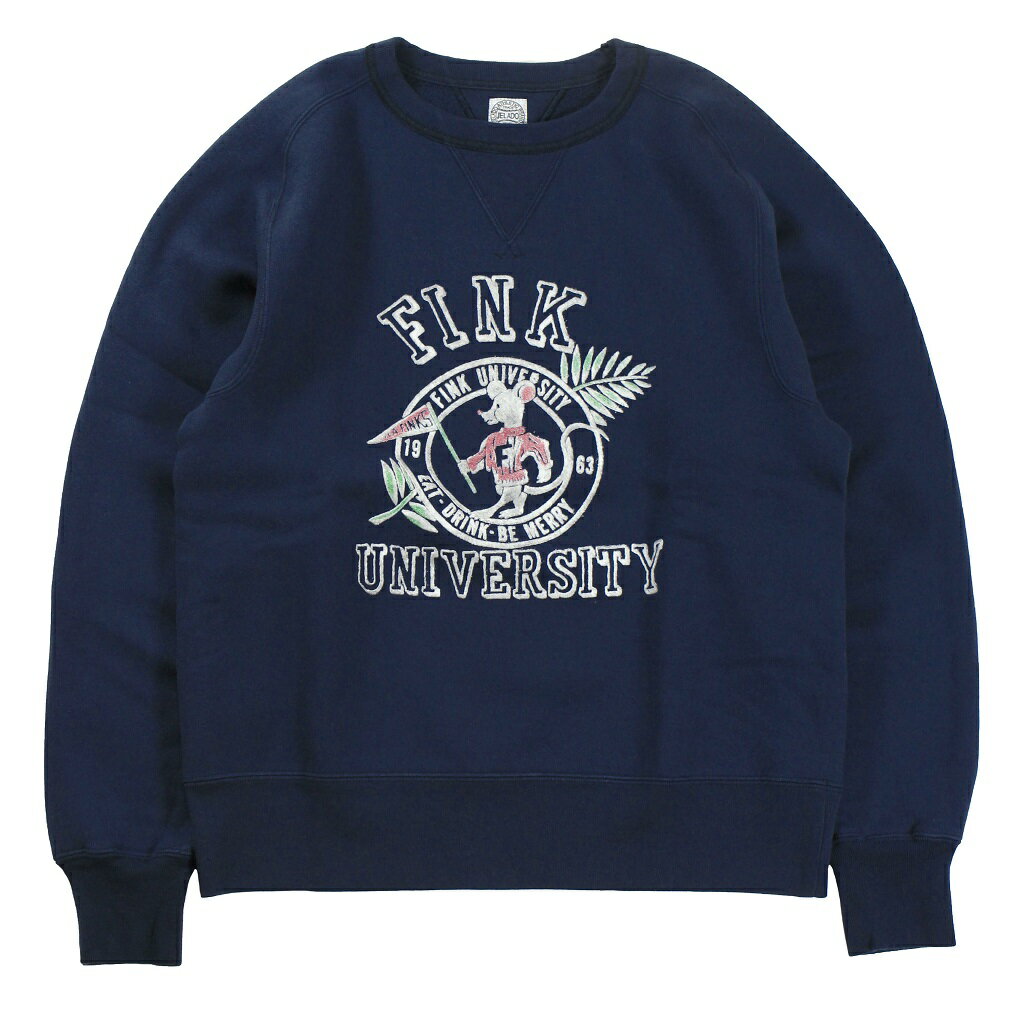 JELADO ["Fink University" Sweat Shirt #AB82222 Old Navy size.M,L,XL] ジェラード スウェット フロッキープリント JELADO-"Fink University" Sweat Shirt #AB82222-・生産国:日本前回に引き続き今回の目玉とも言える最高のフロッキープリントスウェットが出来上がりました。弊社が長年コレクションするカラーフロッキーのヴィンテージを元に電着プリントで仕上げております。前回同様サンプルにしたヴィンテージ同様のカラーの1色展開で今回はオールドネイビーボディにネズミのフロッキープリントをいれております。通常のスクリーンプリントなどでは一つのラインで複数枚同時にプリントができますが、こちらのプリントは熟年の職人さんが一枚ずつ手作業でプリントをしていきます。量産型の機械ではないので通常の何倍も時間もかかりますし、作業前後の掃除や設備の設定に時間もかかるので、この手法でのプリントを実現できるところはありません。そしてフロッキープリントのカレッジアイテムはヴィンテージの相場ではいまや5万円前後で取引されるほど評価の高いアイテムです。ボディは旧式の編み機のアズマ編み機を使って丸胴(脇ハギ無し)で編み立てをしております。アズマ編み機という旧式の編み機はヴィンテージ感のある風合いと軽さが特徴の裏毛です。この編み機は吊り編み機から革新編み機へと替わっていった70年代ころの編み機のひとつで、現存数が少ない希少な編み機です。ゆっくり編むため日産数も少なく、ゆえに凹凸感のある表面とふっくらとした風合いが特徴の吊り編み機のような風合いが楽しめます。起毛に関しても、開反生地であれば1回の作業工程で起毛ができますが、丸起毛の場合には丸を平面に合わせて4面の起毛を程こして、ぐるり1周の作業を行っているため、単純に4倍の手間がかかっております。染色する前に起毛かける先起毛で仕上げています。縫製ビンテージに倣いほぼ二本針ですが、袖口は丸編みリブ、袖口リブは脇下の縫製の2本針からそのまま1回でリブを付けています。当時の縫製をそのまま再現したヴィンテージではもはや手にすることは難しい一枚を再現いたしました。<サイズスペック>Size Width(cm) Length(cm) Shoulder+Sleeve Length(cm)38(M) 51 61 8340(L) 53.5 63.5 8642(XL) 56.5 66.5 90.5※若干の誤差はご了承下さい。---------------------------------------------------------------------------------------*注意*当店は実店舗と商品の在庫を共有しておりますので在庫情報につきまして誤差が生じる場合がございます。ご注文頂いた商品がご用意できない場合がございますが、予めご了承ください。 2