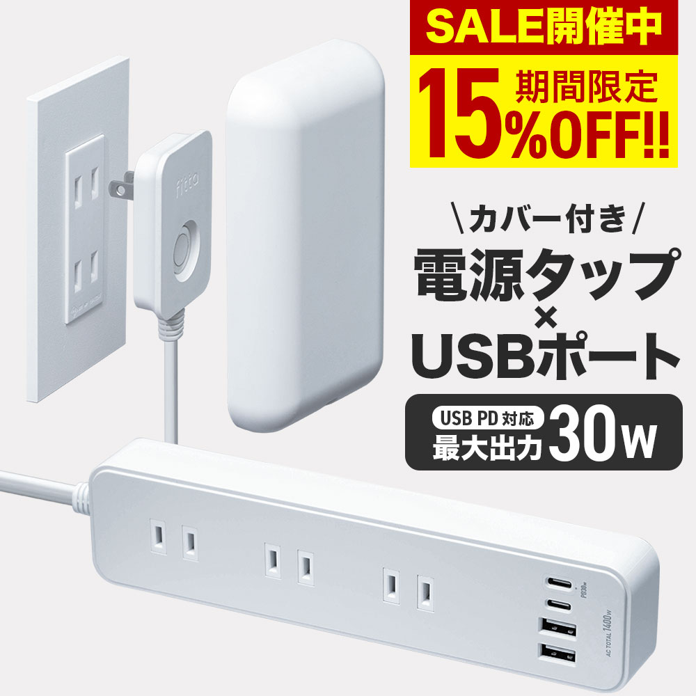 【期間限定15%OFF!!】 fitta 電源タップ USB モデル 最大30W Type-C Type-A 壁に溶け込む コンセントカバー 1.8m 0.9m 3個口 ほこりシャッター コンセント タップ コンセントガード おしゃれ