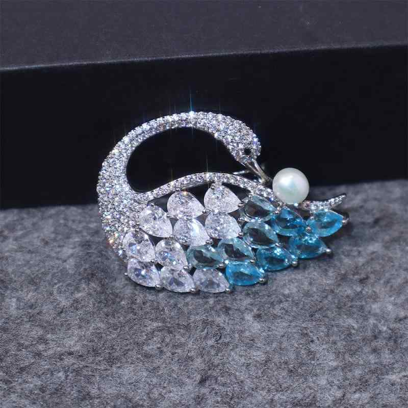 ブローチ レディース スワン 白鳥 青と白 ジルコニア パール パール 高級感 上品 立体 エレガント おしゃれ ファッション コサージュ パーティー 結婚式 普段使い