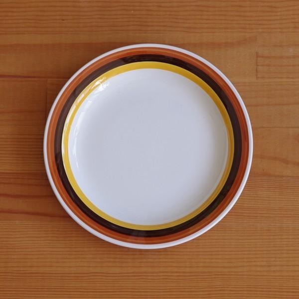 スウェーデンの陶磁器メーカー Rorstrand(ロールストランド)のデザートプレートです。 FOKUS(フォーカス)というシリーズのもので、 ふちに黄色やブラウンのラインが手描きされています。 レトロでスタイリッシュな色合いが人気のシリーズです。 1960〜70年代ごろのものです。 特に目立つチップやヒビはありません。 わずかな擦り傷はありますが、ツヤがあり、 ヴィンテージ品としてはきれいな状態です。 製品本来の品質として、ちょっとした色むらや色汚れ、黒点、不整形等はある場合があります。 詳細は写真にてご判断ください。 こちらの商品は、複数在庫がございますが、 状態に特に差がございませんので、一商品として販売しております。 写真に写る4枚のうちの1枚をお送りいたします。 ご了承ください。 --- ■ サイズ:直径約 18cm ※ 写真に写りこんだデコレーションはお届け内容に含まれません。