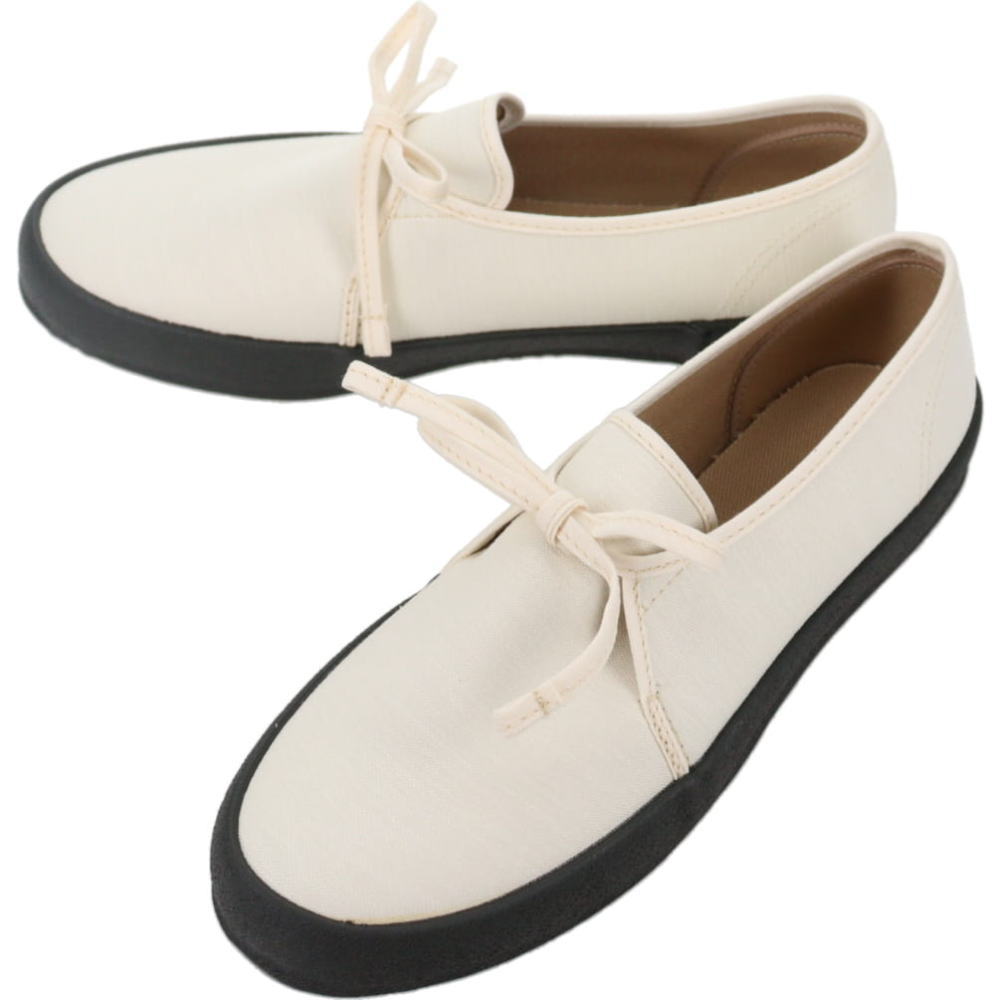 [ ブランド ] ムーンスター MOONSTAR [ ジャンル ] スニーカー [ 素 材 ] アッパー:キャンバス どこか民族的な雰囲気のある、外羽根タイプのシューズ 地下足袋の生産を契機にゴム産業の町として栄えた久留米で、長きに渡り靴を作り続けてきたムーンスター。そこから生み出される靴には長い歴史の中で培ってきた技術と経験が息づいています。1873年の創業以来、一人ひとりに心地よい靴を目指し、今日まで続けてきたまじめな靴作りに自信と誇りを持って“MADE IN KURUME”の靴をこれからも作り続けていきます。 履口から伸びた靴紐が特徴のシンプルな外羽根タイプのシューズ『FOLKSY』。素材にはムラ糸を使って織られたバックサテンを使用しています。簡潔な構造でどこか民族的な雰囲気のある一足。モノトーンを基調とした潔いミニマルさが、スニーカーでありながら上品でシックな佇まいを醸し出しています。ヴァルカナイズ製法による作りの良さも魅力。高品質かつ機能的で美しいスニーカーをぜひご体感ください。 ■ヴァルカナイズ製法 生ゴムに硫黄を加えて熱反応させることで、ゴム底とアッパーを接着し成型する方法です。この反応の結果、ゴムは弾性と強度が加わり、スニーカーソールとしての適性が備わります。ソールとアッパーが強く結合するために丈夫で壊れにくく、型崩れし難い特徴があります。一方で人の手が多くかかり、ほかの製法に比べて生産性が劣るため、敬遠される風潮もありますが、熟練の手仕事でしか生み出せない精巧で美しい“作りの美しさ”が魅力です。 靴/シューズ/フットウェア/shoes/footwear/sneaker/クラシック/メイドインジャパン/made in japan/国産/日本製/外羽根シューズ/バックサテン/秋冬/白系/アイボリー/レディース ※在庫の管理には万全を期しておりますが、実店舗との在庫共有や仕入先様在庫状況の変化により売り違いが発生してしまう場合もございます。誠に恐れ入りますがご理解の上、ご了承下さい。