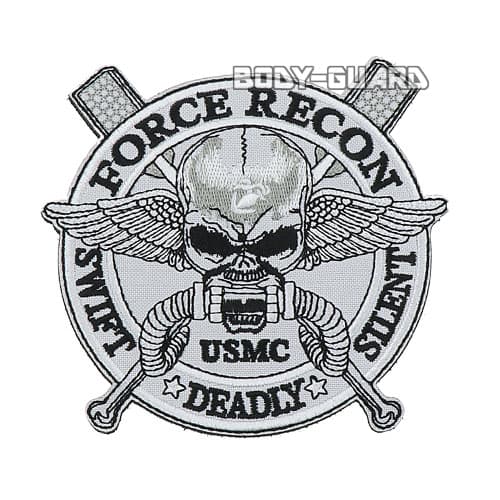 FORCE RECON ワッペン ブラック ホワイト マジックテープ式 サバゲー サバイバルゲーム コスプレ ファッション アイテム ミリタリー アップリケ 刺繍 装飾 簡単 取り外し 大人 アルファベット 英語 ドクロ 骸骨 羽根 アメリカ海兵隊武装偵察部隊【ゆうパケット送料無料】