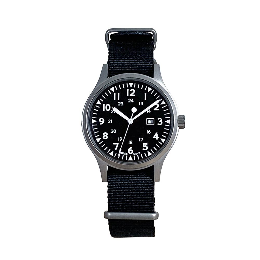 【品番】 MIL.-01B BK 【ムーブメント】クォーツ 【素材】ステンレス 【風防】アクリル製ドームレンズ 【ベルト】NATOタイプナイロン製ベルト 【サイズ】38ミリ径 11.5ミリ厚 【重さ】約60g 【防水】5気圧防水 【保証期間】1年保証付き 【付属品】保証書、説明書付です、純正ボックス。